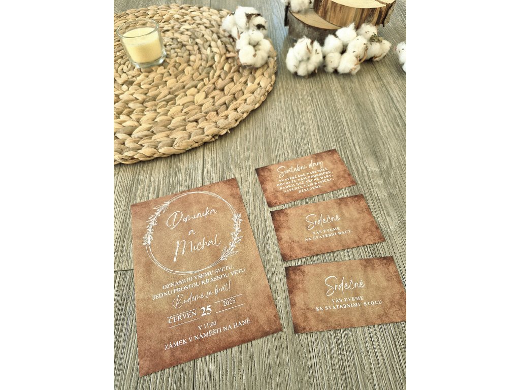 Před dokončením objednávky nezapomeňte v poznámce zanechat Vaše jména, datum, čas a místo svatby. V případě dalších požadavků je možné dohodnout i jiné úpravy textu. Tyto úpravy jsou zahrnuty v ceně oznámení.